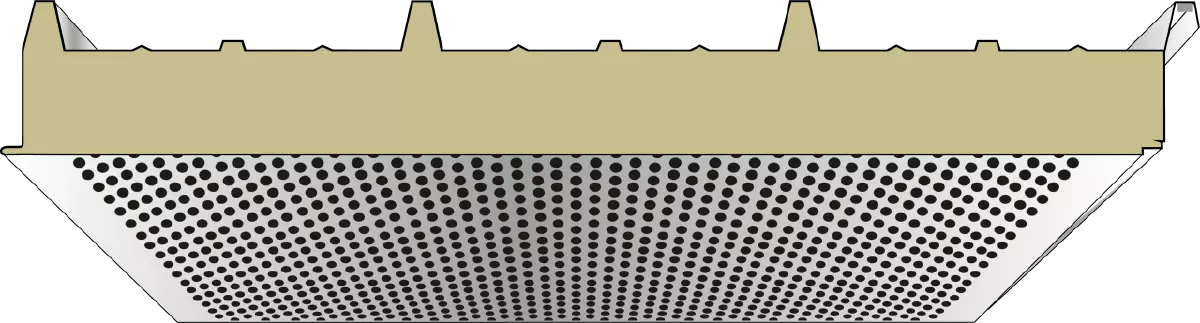 Das Schallschutzelement mit schallabsorbierender gelochter Innenschale eignet sich vorwiegend für den Einsatz in Innenräumen. In dem von Metecno patentierten System ist zwischen der Innenschale und dem Dämmkern aus Mineralwolle ein spezielles Vlies als Rieselschutz eingelegt. Die Ausbildung der Innenschale trägt erheblich zur Verbesserung der Raumakustik bei. Außerdem werden
